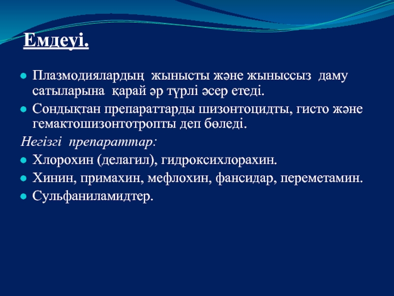 Сондықтан препараттарды шизонтоцидты, гисто және гемактошизонтотропты деп бөледі.