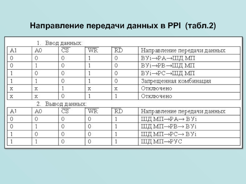 Второй режим – режим двунаправленного обмена. В данном режиме канал В не работает, передача данных происходит через канал А поочередно в двух направлениях. Необходимые управляющие сигналы передаются по линиям порта С.