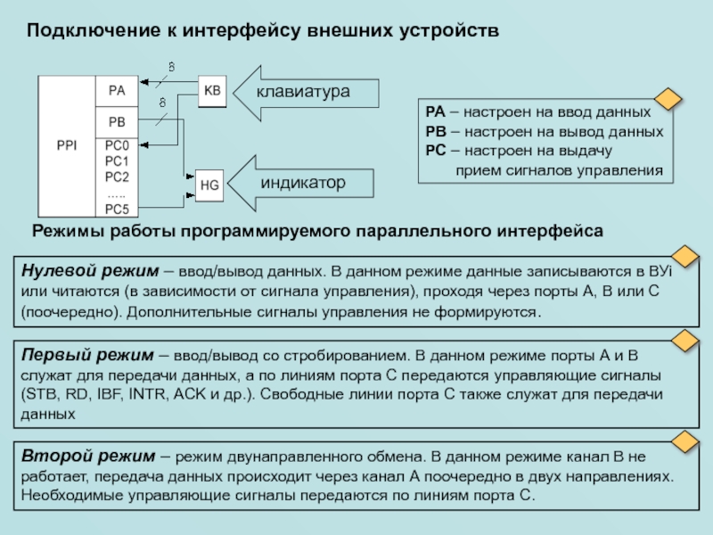 Первый режим – ввод/вывод со стробированием. В данном режиме порты А и В служат для передачи данных, а по линиям порта С передаются управляющие сигналы (STB, RD, IBF, INTR, ACK и др.). Свободные линии порта С также служат для передачи данных