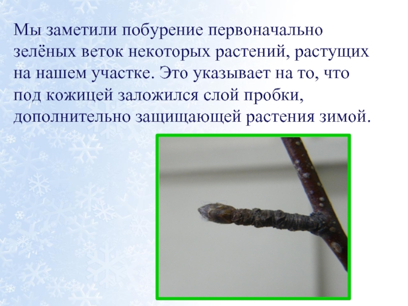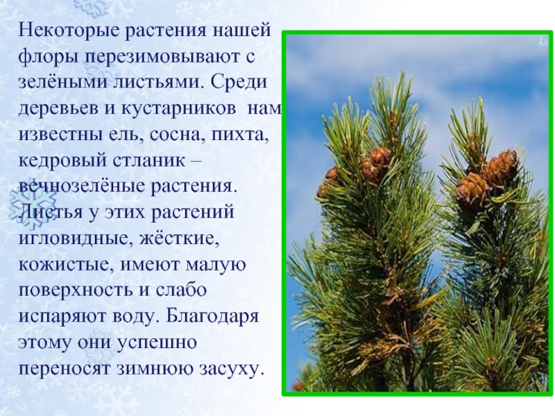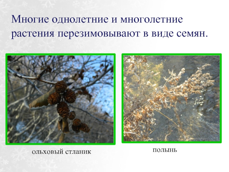 На нашем участке мы нашли растения, которые уходят под снег с зелёными листьями и сохраняют их до весны. Такие растения называются зимне-зелёными. Некоторые зимне-зелёные растения