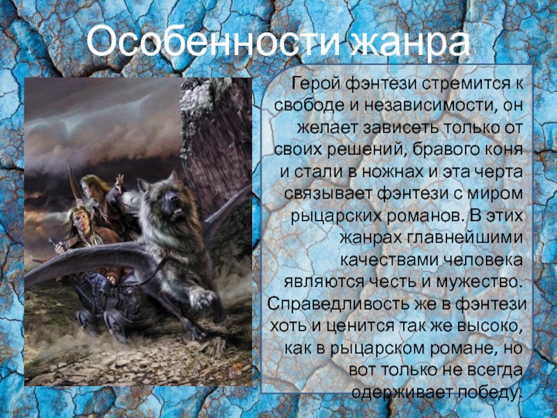 только от своих решений, бравого коня и стали в ножнах и эта черта связывает фэнтези с миром рыцарских романов. В этих жанрах главнейшими качествами человека являются честь и мужество. Справедливость же в фэнтези хоть и ценится так же высоко, как в рыцарском романе, но вот только не всегда одерживает победу.