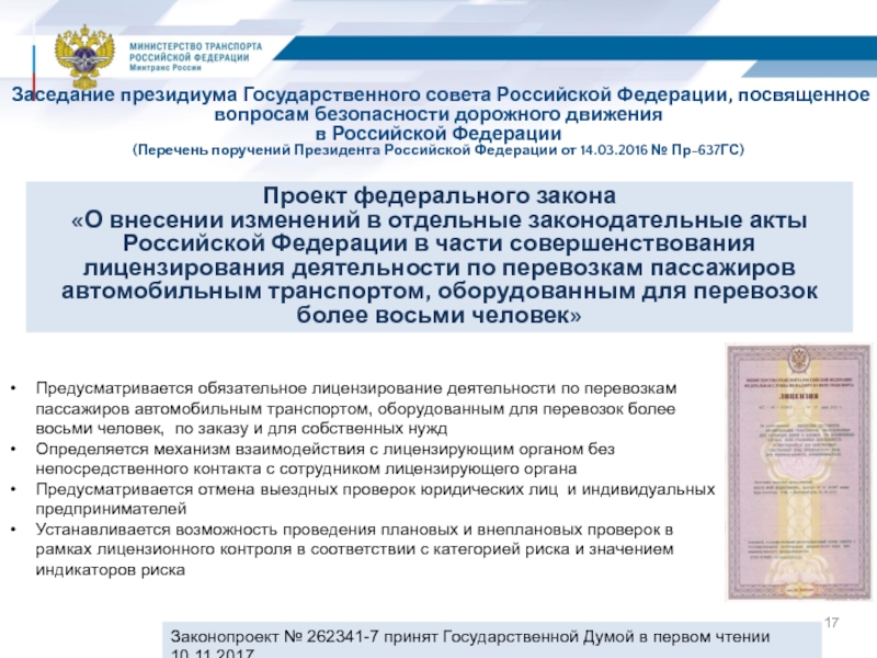«О внесении изменений в отдельные законодательные акты Российской Федерации в части совершенствования лицензирования деятельности по перевозкам пассажиров автомобильным транспортом, оборудованным для перевозок более восьми человек»