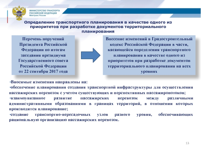 Внесение изменений в Градостроительный кодекс Российской Федерации в части, касающейся определения транспортного планирования в качестве одного из приоритетов при разработке документов территориального планирования на всех уровнях