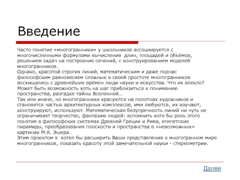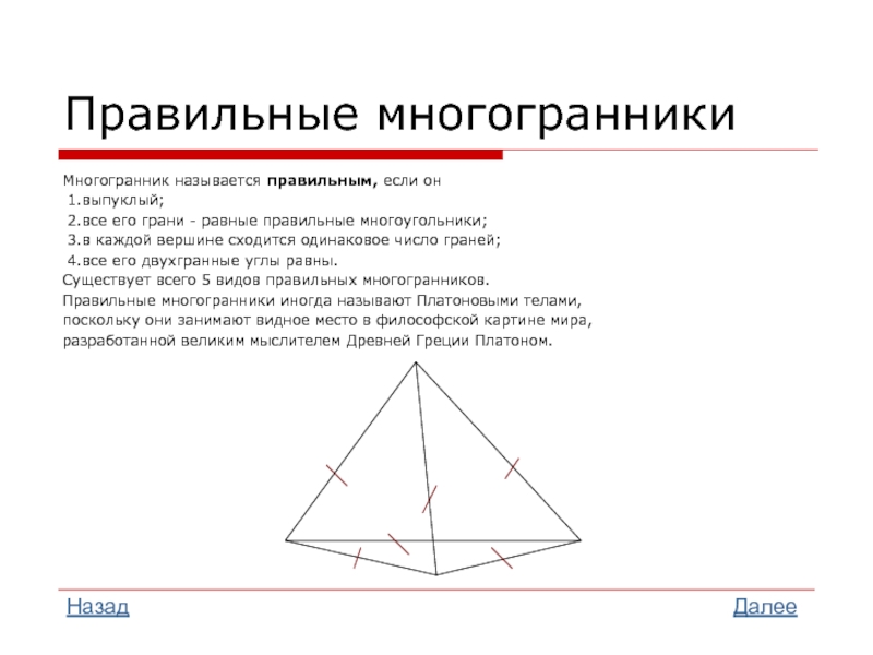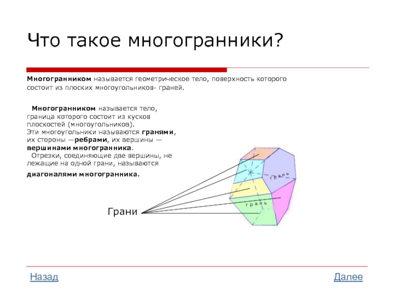 Эти многоугольники называются гранями, их стороны —ребрами, их вершины — вершинами многогранника.