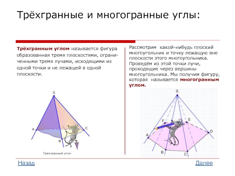 Рассмотрим какой-нибудь плоский многоугольник и точку лежащую вне плоскости этого многоугольника. Проведём из этой точки лучи, проходящие через вершины многоугольника. Мы получим фигуру, которая называется многогранным углом.