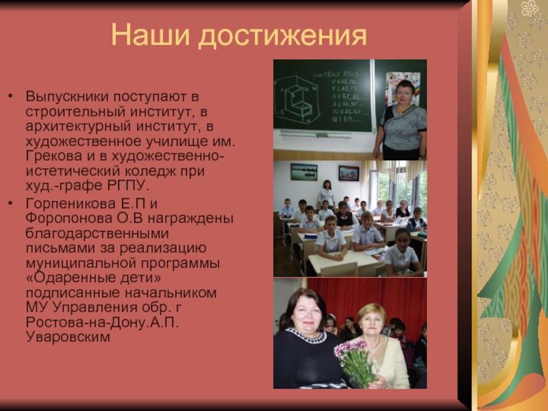 Горпеникова Е.П и Форопонова О.В награждены благодарственными письмами за реализацию муниципальной программы «Одаренные дети» подписанные начальником МУ Управления обр. г Ростова-на-Дону.А.П. Уваровским