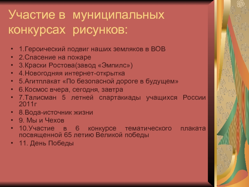 Слайд 4Участие в муниципальных конкурсах рисунков: