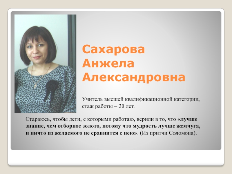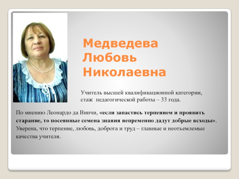 Учитель высшей квалификационной категории, стаж педагогической работы – 33 года.