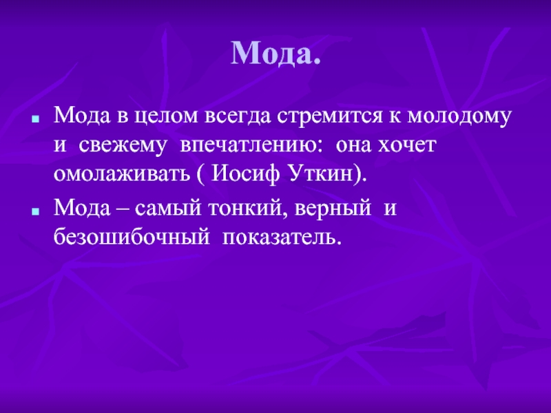 Модой в самом широком смысле слова называют существующие в определенный период и общепризнанное на данном этапе отношение к внешним формам культуры: к стилю жизни, обычаям, сервировки и поведения за столом, автомашинам, одежде. Однако при употреблении слова мода, обычно имеют в виду одежду.