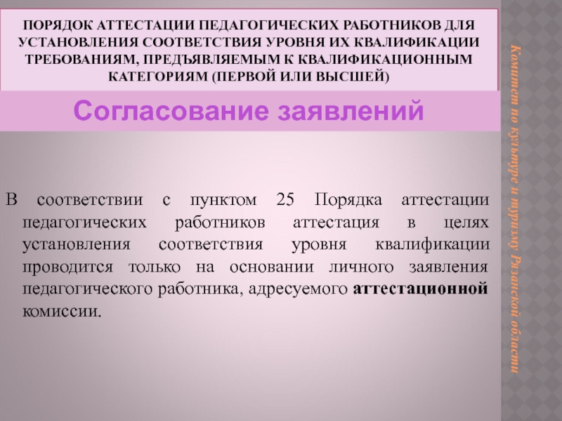 В соответствии с пунктом 25 Порядка аттестации педагогических работников аттестация в целях установления соответствия уровня квалификации проводится только на основании личного заявления педагогического работника, адресуемого аттестационной комиссии.