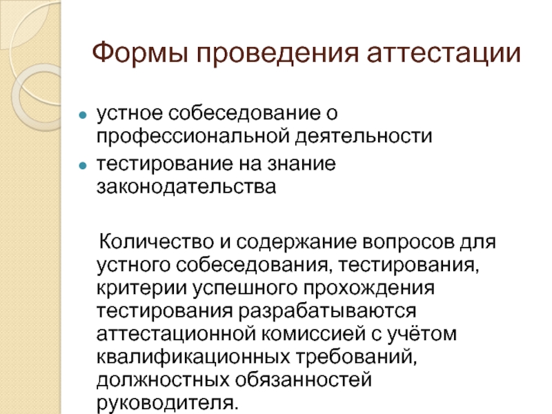 Количество и содержание вопросов для устного собеседования, тестирования, критерии успешного прохождения тестирования разрабатываются аттестационной комиссией с учётом квалификационных требований, должностных обязанностей руководителя.