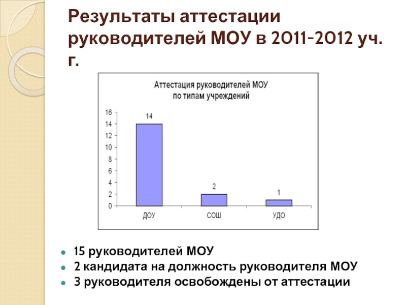 Слайд 13Результаты аттестации руководителей МОУ в 2011-2012 уч.г.