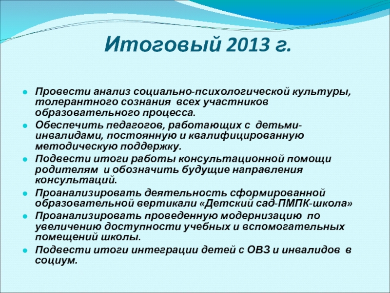 Подвести итоги интеграции детей с ОВЗ и инвалидов в социум.