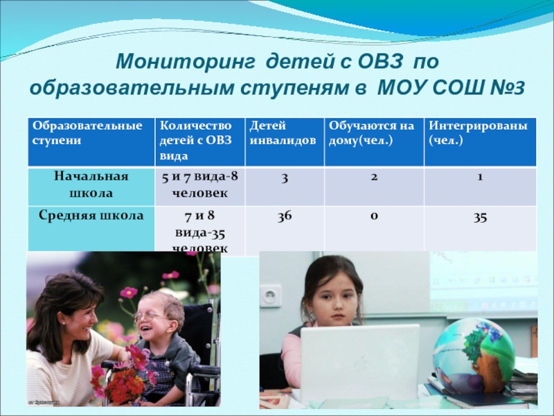Слайд 10Мониторинг детей с ОВЗ по образовательным ступеням в МОУ СОШ №3