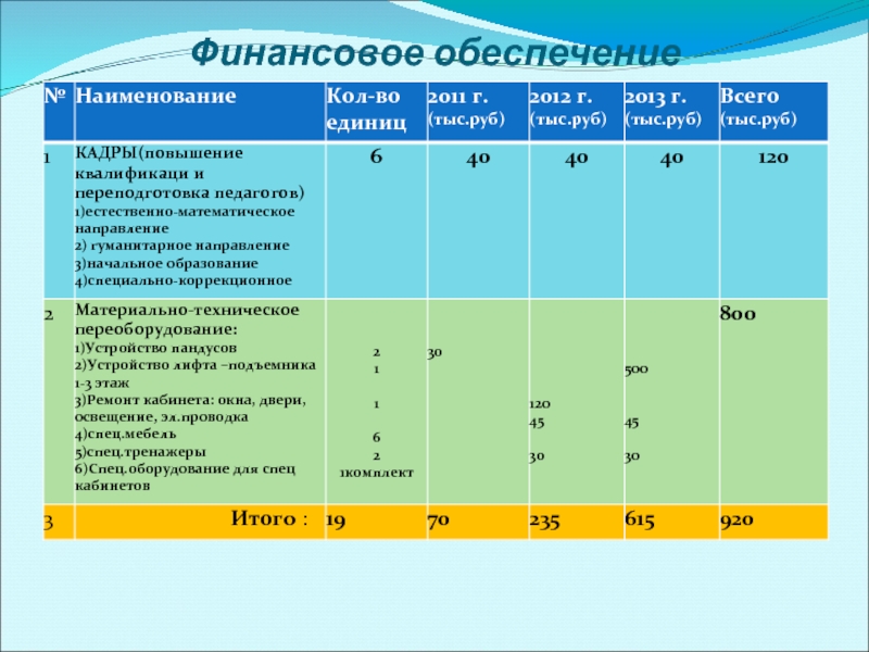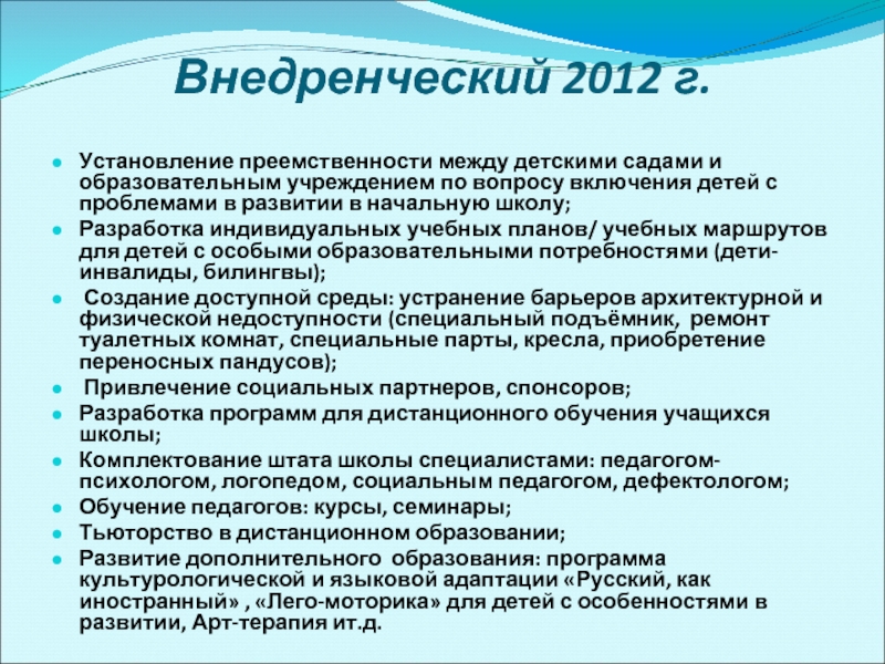 Создание доступной среды: устранение барьеров архитектурной и физической недоступности (специальный подъёмник, ремонт туалетных комнат, специальные парты, кресла, приобретение переносных пандусов);