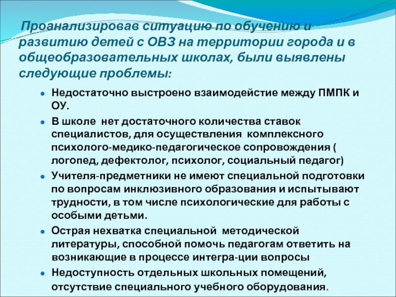В школе нет достаточного количества ставок специалистов, для осуществления комплексного психолого-медико-педагогическое сопровождения ( логопед, дефектолог, психолог, социальный педагог)
