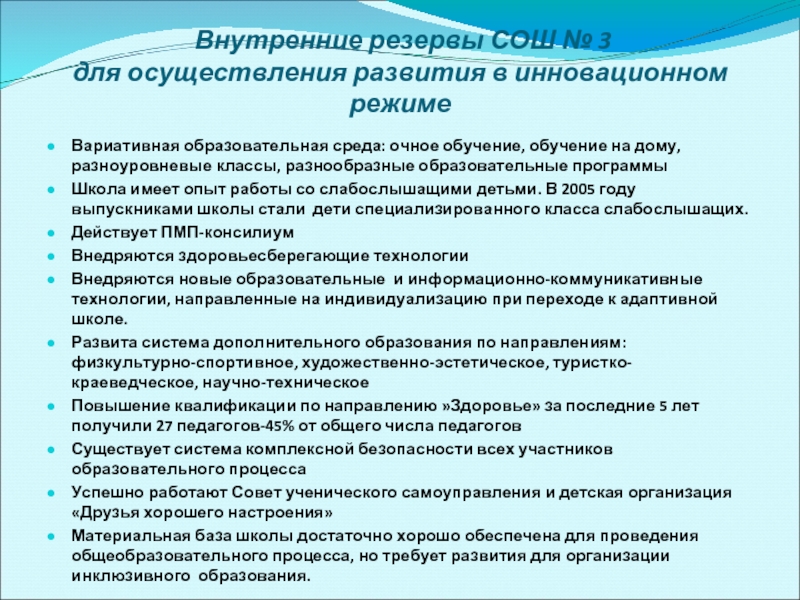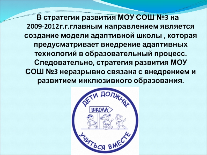 модели адаптивной школы , которая предусматривает внедрение адаптивных технологий в образовательный процесс. Следовательно, стратегия развития МОУ СОШ №3 неразрывно связана с внедрением и развитием инклюзивного образования.