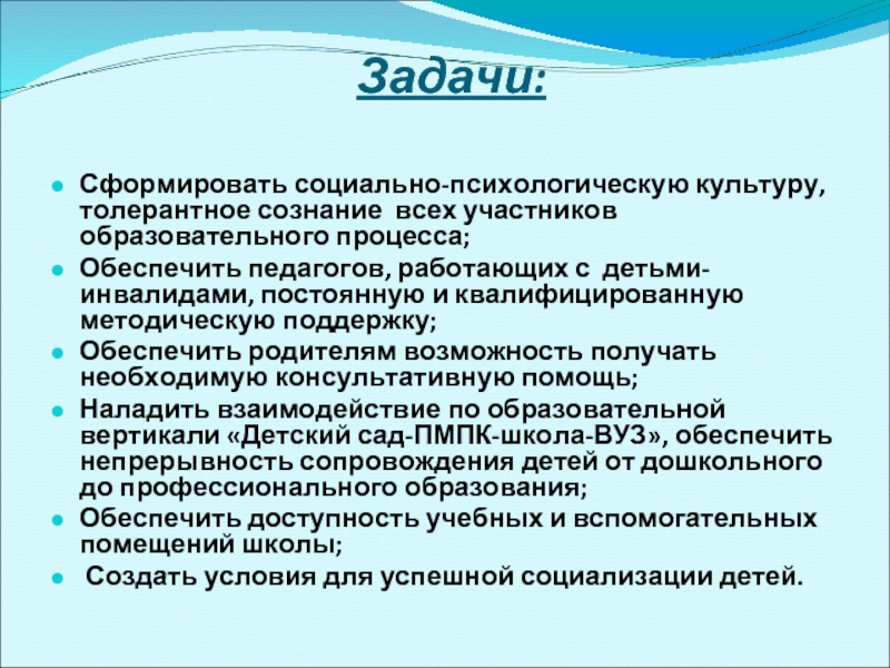 Обеспечить педагогов, работающих с детьми-инвалидами, постоянную и квалифицированную методическую поддержку.