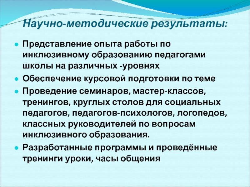 Проведение семинаров, мастер-классов, тренингов, круглых столов для социальных педагогов, педагогов-психологов, логопедов, классных руководителей по вопросам инклюзивного образования.