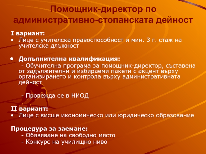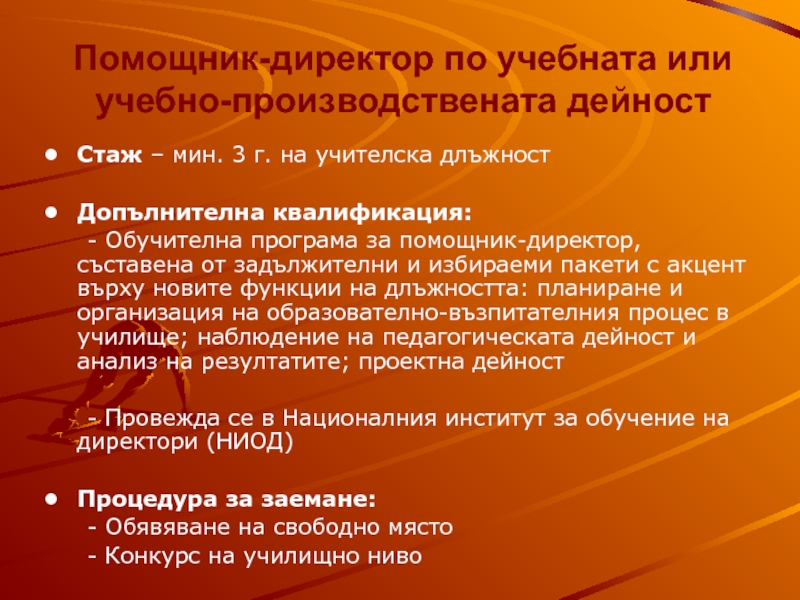 Слайд 13Помощник-директор по учебната или учебно-производствената дейност
