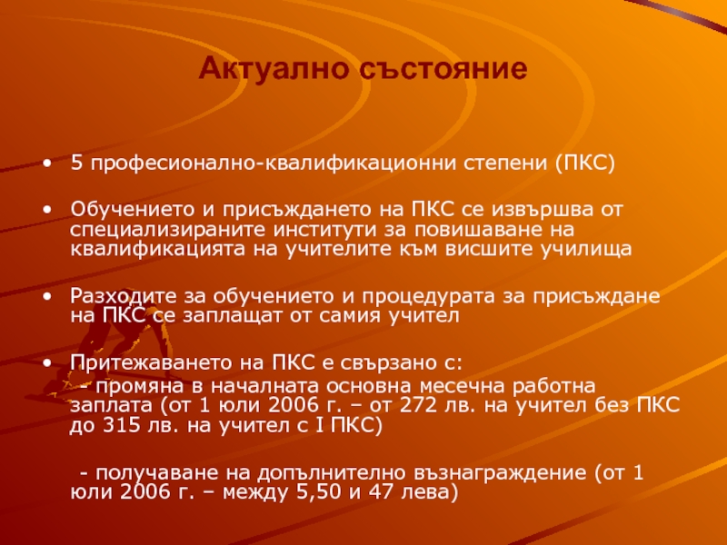 - промяна в началната основна месечна работна заплата (от 1 юли 2006 г. – от 272 лв. на учител без ПКС до 315 лв. на учител с I ПКС)