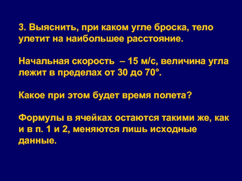 Слайд 183. Выяснить, при каком угле броска, тело улетит на наибольшее расстояние.