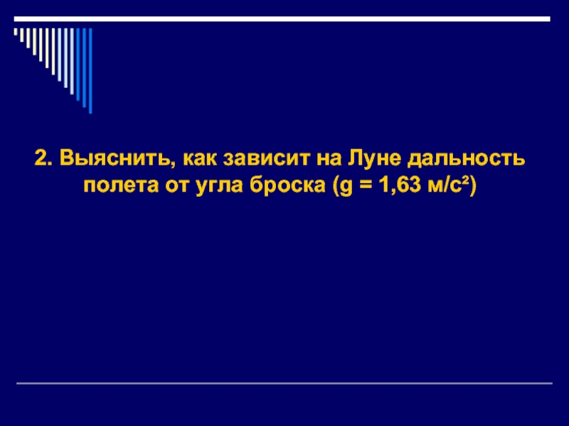 Слайд 172. Выяснить, как зависит на Луне дальность полета от угла броска