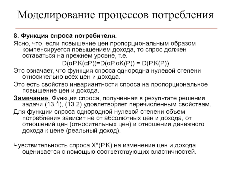 Для функции спроса однородной нулевой степени объем потребления зависит не от абсолютных цен и дохода, от отношений цен (относительных цен) и отношения денежного дохода к цене (реальный доход).
