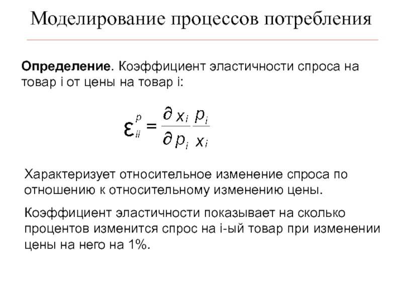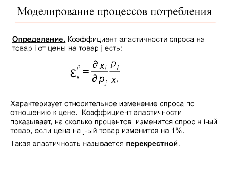 Характеризует относительное изменение спроса по отношению к цене. Коэффициент эластичности показывает, на сколько процентов изменится спрос н i-ый товар, если цена на j-ый товар изменится на 1%.