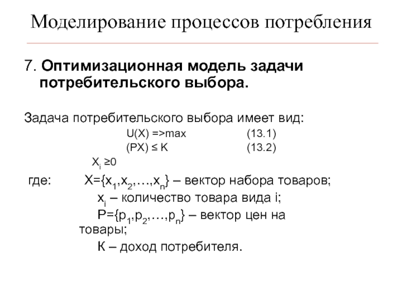 Зная, что оптимальное решение задачи (13.1), (13,2) лежит на бюджетной линии, мы можем априори считать, что доход потребителя будет использован полностью. Тогда в (13.4)-(13.7) останутся только равенства: