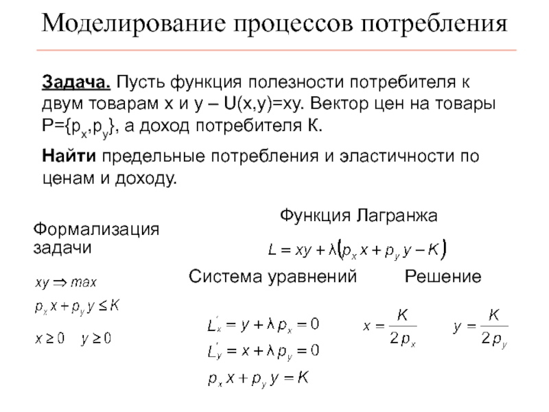 Задача. Пусть функция полезности потребителя к двум товарам х
