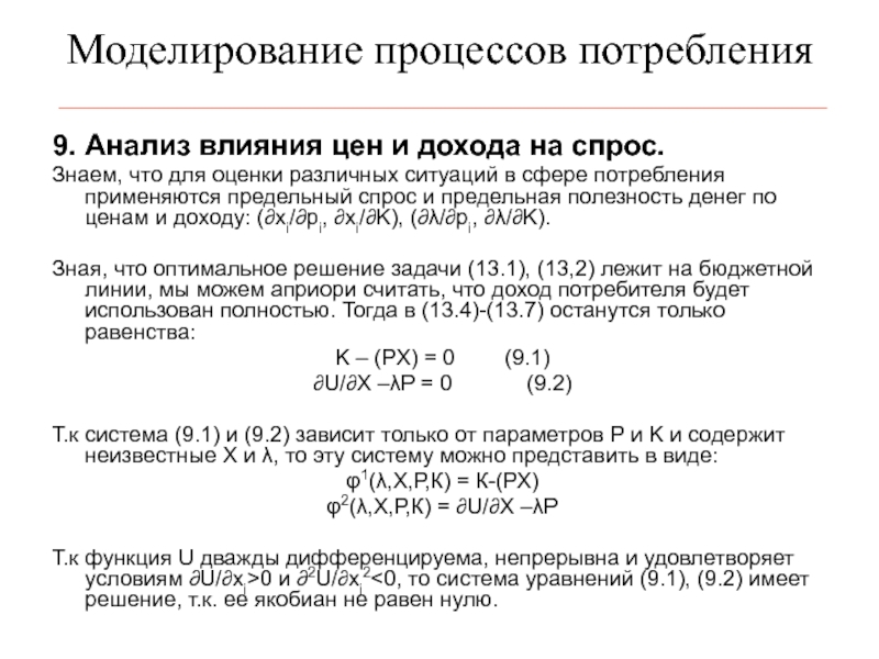 Т.к функция U дважды дифференцируема, непрерывна и удовлетворяет условиям ∂U/∂xi>0 и ∂2U/∂xi2<0, то система уравнений (9.1), (9.2) имеет решение, т.к. ее якобиан не равен нулю.