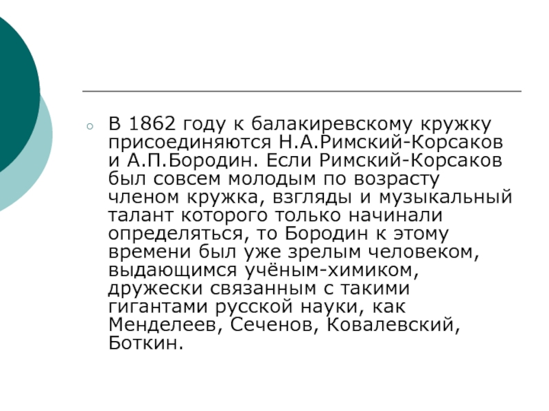 В 1862 году к балакиревскому кружку присоединяются Н.А.Римский-Корсаков и А.П.Бородин. Если