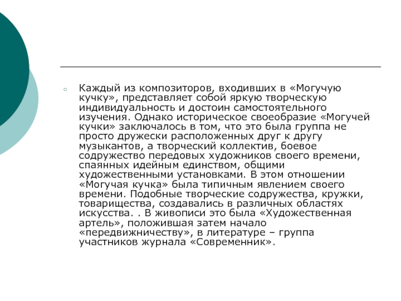индивидуальность и достоин самостоятельного изучения. Однако историческое своеобразие «Могучей кучки» заключалось в том, что это была группа не просто дружески расположенных друг к другу музыкантов, а творческий коллектив, боевое содружество передовых художников своего времени, спаянных идейным единством, общими художественными установками. В этом отношении «Могучая кучка» была типичным явлением своего времени. Подобные творческие содружества, кружки, товарищества, создавались в различных областях искусства. . В живописи это была «Художественная артель», положившая затем начало «передвижничеству», в литературе – группа участников журнала «Современник».