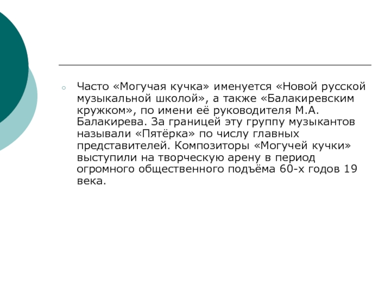кружком», по имени её руководителя М.А.Балакирева. За границей эту группу музыкантов называли «Пятёрка» по числу главных представителей. Композиторы «Могучей кучки» выступили на творческую арену в период огромного общественного подъёма 60-х годов 19 века.