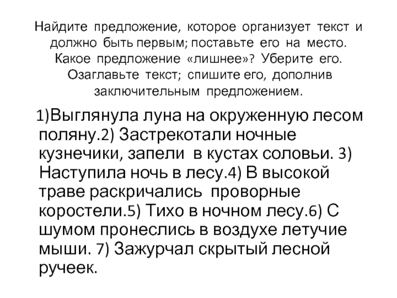1)Выглянула луна на окруженную лесом поляну.2) Застрекотали ночные кузнечики, запели в кустах соловьи. 3) Наступила ночь в лесу.4) В высокой траве раскричались проворные коростели.5) Тихо в ночном лесу.6) С шумом пронеслись в воздухе летучие мыши. 7) Зажурчал скрытый лесной ручеек.