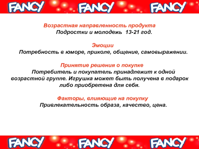 Потребитель и покупатель принадлежит к одной возрастной группе. Игрушка может быть получена в подарок либо приобретена для себя.