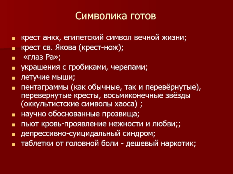 пентаграммы (как обычные, так и перевёрнутые), перевернутые кресты, восьмиконечные звёзды (оккультистские символы хаоса) ;