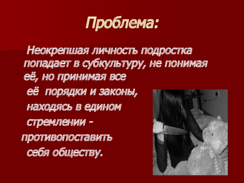 Неокрепшая личность подростка попадает в субкультуру, не понимая её, но принимая