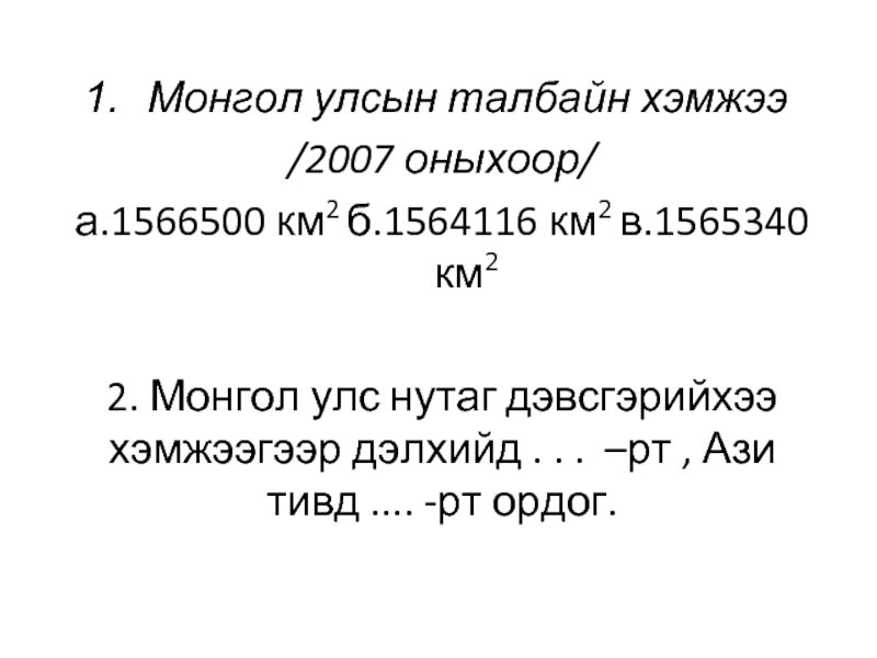 Монгол улс нутаг дэвсгэрийхээ хэмжээгээр дэлхийд . . . –рт , Ази тивд .... -рт ордог.