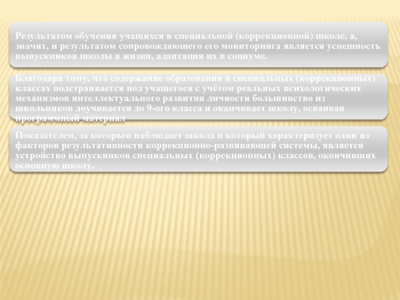 Благодаря тому, что содержание образования в специальных (коррекционных) классах подстраивается под учащегося с учётом реальных психологических механизмов интеллектуального развития личности большинство из школьников доучивается до 9-ого класса и оканчивает школу, осваивая программный материал