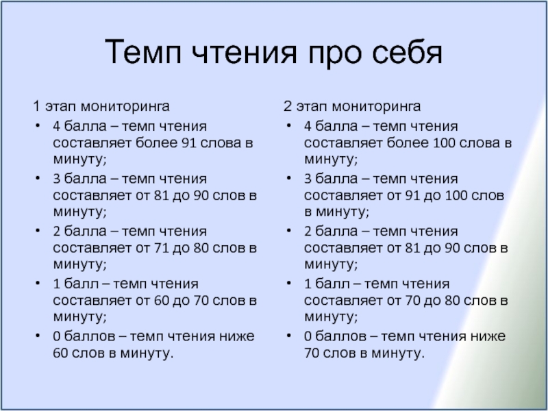 1 балл – темп чтения составляет от 60 до 70 слов в минуту;