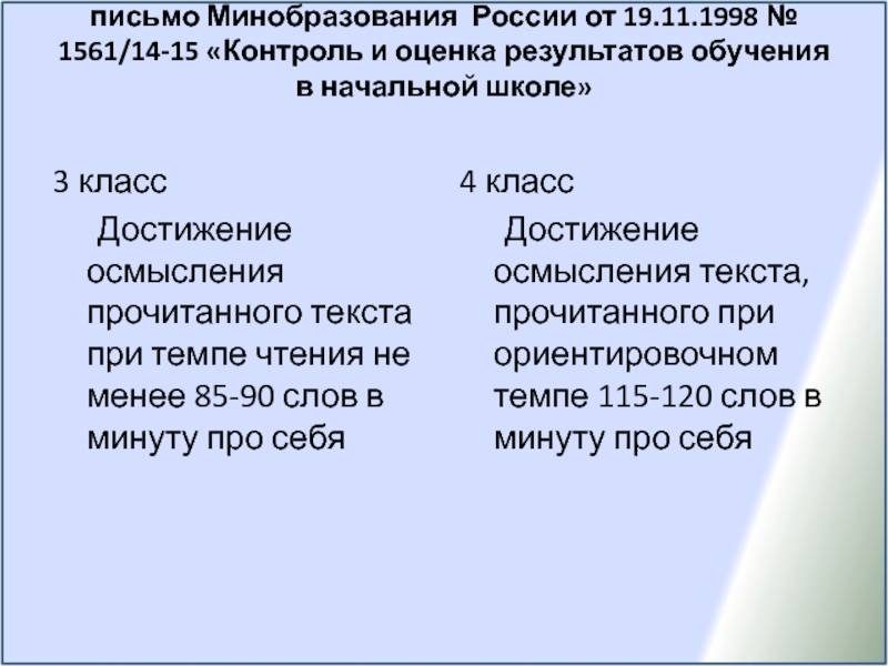 Слайд 13письмо Минобразования России от 19.11.1998 № 1561/14-15 «Контроль и оценка результатов