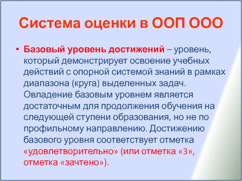 освоение учебных действий с опорной системой знаний в рамках диапазона (круга) выделенных задач. Овладение базовым уровнем является достаточным для продолжения обучения на следующей ступени образования, но не по профильному направлению. Достижению базового уровня соответствует отметка «удовлетворительно» (или отметка «3», отметка «зачтено»).