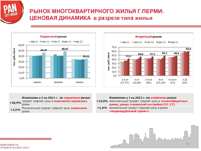 Слайд 11РЫНОК МНОГОКВАРТИРНОГО ЖИЛЬЯ Г.ПЕРМИ: ЦЕНОВАЯ ДИНАМИКА в разрезе типа жилья