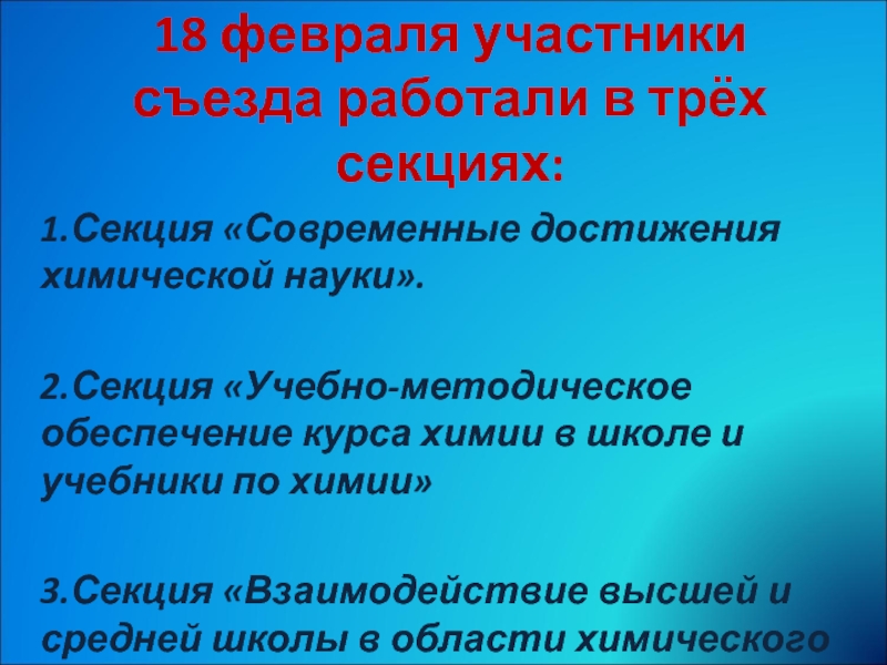 Слайд 1218 февраля участники съезда работали в трёх секциях: