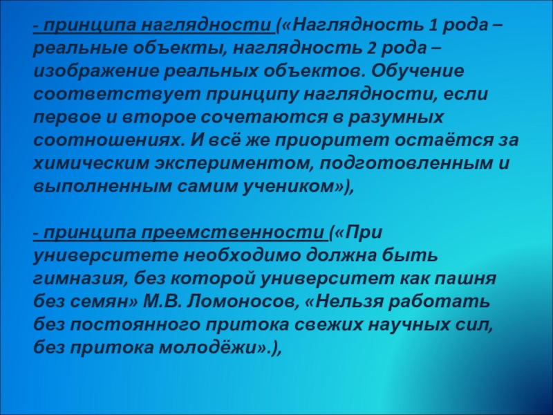 - принципа преемственности («При университете необходимо должна быть гимназия, без которой университет как пашня без семян» М.В. Ломоносов, «Нельзя работать без постоянного притока свежих научных сил, без притока молодёжи».),
