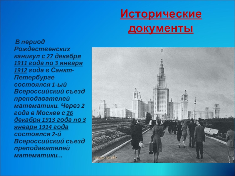 по 3 января 1912 года в Санкт-Петербурге состоялся 1-ый Всероссийский съезд преподавателей математики. Через 2 года в Москве с 26 декабря 1913 года по 3 января 1914 года состоялся 2-й Всероссийский съезд преподавателей математики...