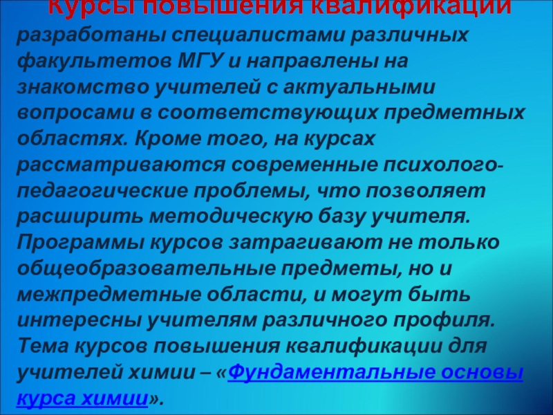 Тема курсов повышения квалификации для учителей химии – «Фундаментальные основы курса химии».