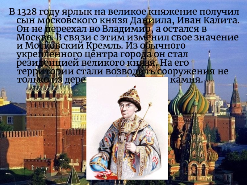 князя Даниила, Иван Калита. Он не переехал во Владимир, а остался в Москве. В связи с этим изменил свое значение и Московский Кремль. Из обычного укрепленного центра города он стал резиденцией великого князя. На его территории стали возводить сооружения не только из дерева, но и из белого камня.